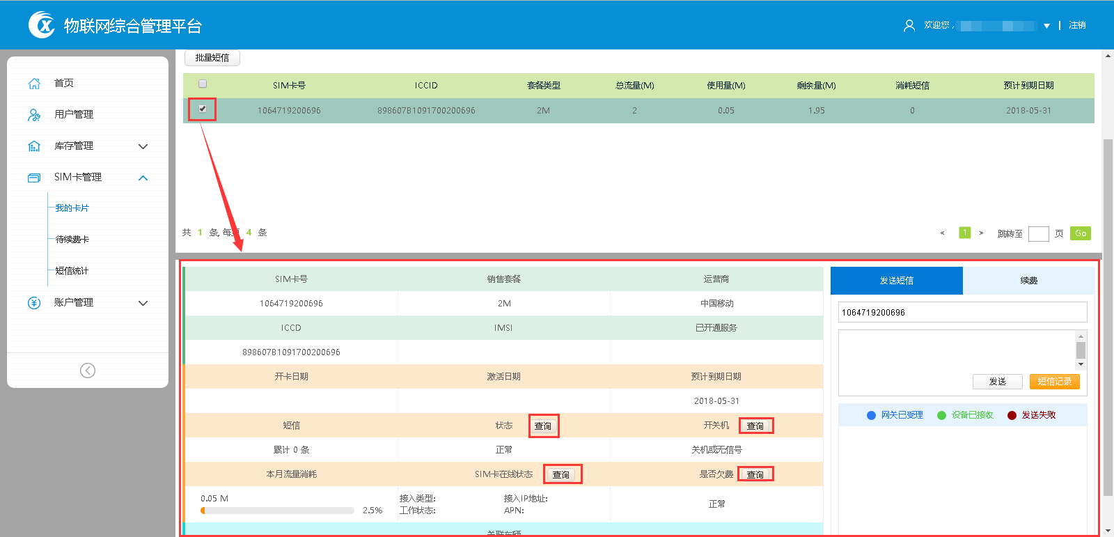 点详细信息前面的选框,显示该卡的实时信息,其中 状态、开关机、SIM卡在线状态、是否欠费旁边的查询按钮,是从移动获取卡的最新状态信息:图13